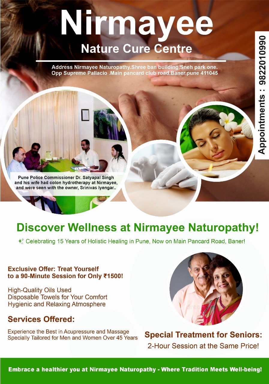 Colon Hydrotherapy In Pune | Colon Hydrotherapy Treatment In Pune |Shirodhara Therapy Treatment in Pune. At NIRMAYEE we seek to provide our patients with the best health care available. Our professional staff strives not only to treat the health problems, but also helps you to achieve the goal of maximising your health potential. “NIRMAYEE - Nature Cure Centre” encompasses not only the treatment of diseases, but strives to achieve and maintain optimal levels of health. Nevertheless, our patients can utilise the individual services of our professional staff. Our programs are especially designed to suit individual needs. NIRMAYEE offers an alternative for individuals seeking specialised health care. By combining knowledge and resources of chiropractic, naturopathy, acupuncture, kinesiology, massage therapy, chiropody and counselling, we offer patients access to the finest diagnostic tools, treatments and therapies available from each discipline. IMG_4455 Welcome to Nirmayee Wellness, your partner in holistic well-being! Our Weight Loss Program, based in the serene surroundings of Baner, Pune, is designed to transform your lifestyle and rejuvenate your body, mind, and spirit. Our comprehensive packages encompass stay, nourishing food, and therapeutic sessions, ensuring a personalized and immersive wellness experience. Program Highlights: Location: Nestled near our Wellness Centre in Baner, our in-patient program spans 30-40 days, providing you with a supportive and tranquil environment for your weight loss journey. Stay: Immerse yourself in the comfort of our accommodation facilities, designed to promote relaxation and healing. Our cozy rooms offer a perfect retreat during your transformative stay. Culinary Delights: Indulge in our thoughtfully curated and nutritionally balanced meals, specially crafted to aid your weight loss journey. Our culinary experts blend taste and health to create a menu that delights your taste buds while supporting your goals. Therapeutic Sessions: Experience a range of therapeutic treatments tailored to address your individual needs. From rejuvenating massages to stress-relieving yoga sessions, our expert therapists are committed to enhancing your overall well-being. Immune Boosting Treatment: As part of our commitment to your holistic health, our program includes immune-boosting treatments to fortify your body against external stressors. Our wellness experts will guide you through specialized sessions aimed at strengthening your immune system. Package Details: Duration: 30-40 days Cost: Starting at ₹8000 per day, per person Why Choose Nirmayee Wellness: Expert Guidance: Our team of experienced wellness professionals and nutritionists are dedicated to guiding you on your weight loss journey. Personalized Approach: We understand that each individual is unique. Our programs are customized to meet your specific needs, ensuring a tailored and effective wellness plan. Serene Environment: Located in Baner, our Wellness Centre provides a peaceful and rejuvenating atmosphere, facilitating your overall well-being. Embark on your path to a healthier, happier you with Nirmayee Wellness. Contact us today ON 9822010990 to book your transformative Weight Loss Program package. Your journey to wellness begins here!.